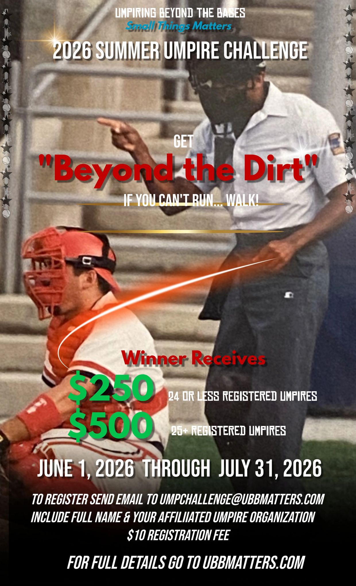 “Beyond the Dirt!” Umpire Challenge is a competition for any umpire working Division 3 and 4, college summer league, independent leagues, or lower levels including high school, travel baseball, little league or equivalent; nonprofessional men’s leagues, etc. Umpire must complete the UBB Beyond the Dirt challenge registration form to be eligible. Form must be submitted no later than May 25, 2026. Challenge starts June 1, 2026 and ends July 31, 2026. Winner announced August 17, 2026. Each umpire has a personal commitment to themselves, UBB, their associated umpire organization(s), any event/tournament they work, and the teams to simply get, “Beyond the Dirt” at home plate as play requires when working as the plate umpire.